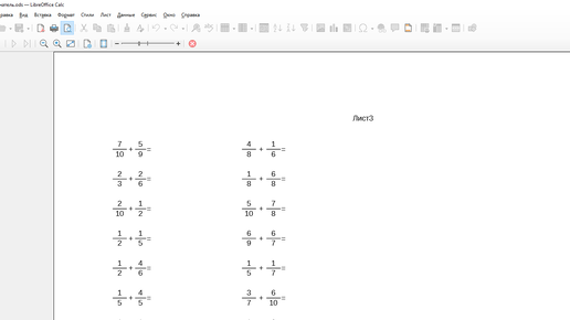 Сегодня расскажу как можно быстро напечатать простой тренажер (или варианты для самостоятельной) на сложение дробей с разными знаменателями. Пользоваться для этих целей буду табличным редактором LibreOffice Calc, но аналогично можно сделать и в Excel. Засекаем время в момент открытия текстового редактора и начинаем писать. В ячейку A3 набираем: =СЛУЧМЕЖДУ(2;10) В ячейку A2: =СЛУЧМЕЖДУ(1;A3-1) Вот так: Не уходя из ячейки A2 нажмем на кнопку добавления нижней границы. Выделяем ячейки B2:B3 и нажимаем...