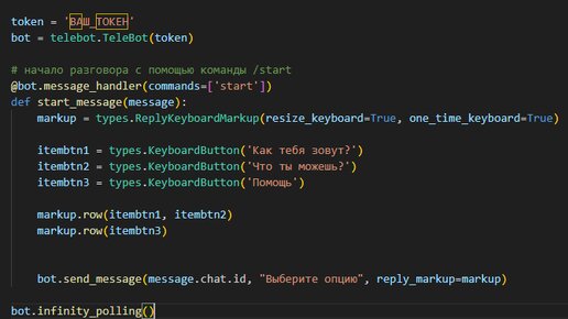 1 шаг: скачиваем Visual Studio Code с официального сайта. Дальше делаем все по инструкции: Устанавливаем официальную версию Python: Установка Python Выбираем Python File: 2 шаг: Открываем CMD-терминал. Нажимаем комбинацию "Win + x" 3 шаг: Устанавливаем нужные библиотеки. прописываем - pip install python-telegram-bot прописываем - pip install pyTelegramBotAPI прописываем - !pip install pyTelegramBotAPI 4 шаг: Начинаем писать код бота. import telebot from telebot import types token = 'ТУТ_ДОЛЖЕН_БЫТЬ_ВАШ_ТОКЕН' bot = telebot...