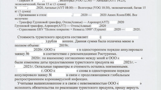 Я писала несколько раз, что-то корректировали, опять переписывала, но в итоге документы приняли и даже деньги вернули. Тур у нас был куплен в сентябре 2019 года на весну 2020, потом перенесен на весну 2021 года. Покупали напрямую у ТО "Пегас" он-лайн на их сайте, ни с какими агентствами не связывались, оплачивали сразу полную стоимость. В апреле 2021 после очередного запрета вылетов и аннулирования тура в Турцию я начала вести переписку с "Пегасом" по электронной почте. Ни к какому согласию по переносу...
