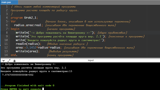 Пишем программу для расчёта периметра и площади прямоугольника в Pascal.