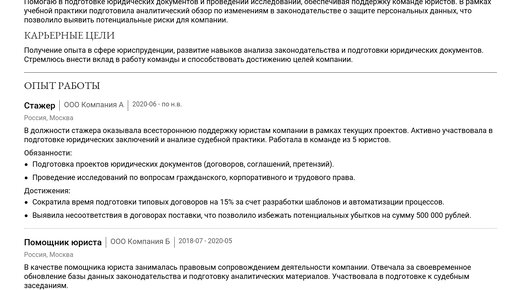 Пример резюме стажера в юридическую фирму 2025 - готовый