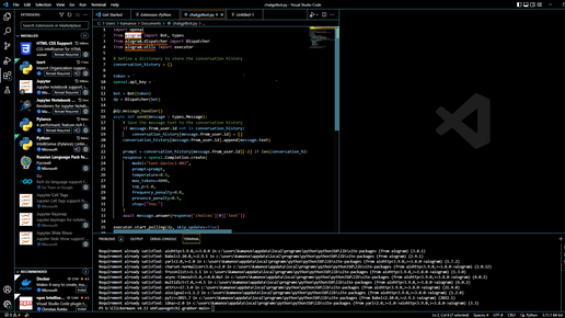 Сейчас буквально весь мир говорит о ChatGPT. В связи со сложившейся политической обстановкой в России данный сервис не доступен без VPN. Но чтобы не морочиться каждый раз с VPN я решил написать бота в Telegram на Python и подключить api openai. Даже если вы ничего не поняли, то ничего страшного. Я расскажу всё поэтапно. Сразу предупрежу вас о том, что понадобится VPN и зарубежный номер, для регистрации на OpenAI (п.2.1) 1. Установка и настройка среды программирования Я использую VS Code так как в нём можно не только писать код, но и запускать скрипт...