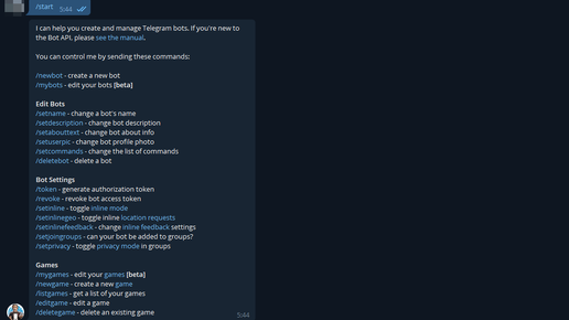 В этом блоке я разберу команды от BotFather. Пусть это и интуитивно понятно, но думаю кому-нибудь понадобится. На картинке представлены все основные настройки бота. При выборе какой-либо из них BotFather попросит выбрать конкретного бота (если их несколько). /setdescription - change bot description Первая настройка после выбора имени это описание которое появится при входе в диалоговое окно с ботом Выглядеть это будет вот так: Следующая команда это: /setabouttext Она указывает инфу которую конечный пользователь увидит в профиле Команда /setuserpic, позволяет выбрать фото профиля...