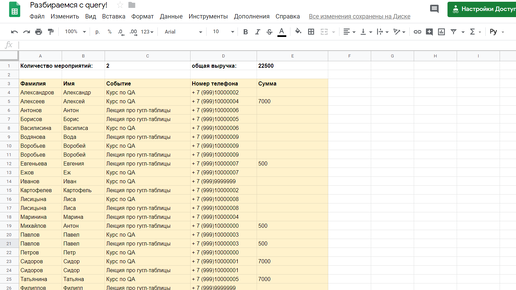 Гугл-таблицы — мой любимый инструмент. Люблю нагородить в них многоэтажных формул, что всё само считалось и откуда-нибудь подтягивалось. Недавно выяснила, что городить далеко не всегда нужно: есть волшебная функция Query, которая заменяет собой многие ВПРы с ГПРами. Расскажу на примере реальной задачи, как я научилась работать с Query и ускорила работу с гугл-таблицами. Задачка про мероприятия В нашем офисе проходят разные мероприятия, данные по ним собирают разные люди в разные таблицы. Где-то это просто список участников, где-то выгрузка с Таймпада...