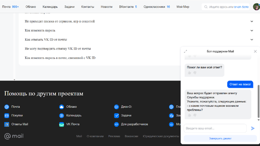 Можно ли в почте Mail.ru спросить о проблеме у живого оператора, а не у чат-бота