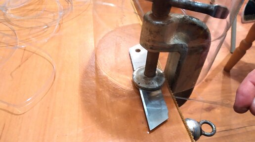 Не так давно пробовал освоить резку пластиковых бутылок в ленту и искал способ попроще. Из всего, что попалось на глаза, понравился именно этот способ, применение которого в быту реально для большинства желающих. Для дела нужны: старая мясорубка, сменное лезвие и несколько монеток большого диаметра. Работать пришлось на полке, так как мясорубку нужно было перевернуть вверх тормашками и использовать так, чтобы её корпус заходил под стол, что не на каждом столе получится. На две монеты кладу сменное лезвие, как на снимке...