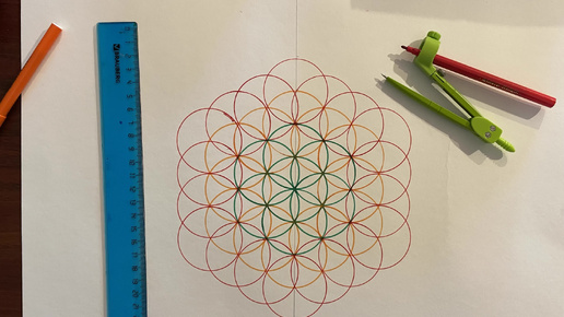 Сначала нарисуйте семь окружностей Семени жизни. Как это сделать подробно рассказала и показала с картинками здесь Далее, не меняя радиус, нарисуйте восьмую окружность с центром в точке пересечения второй окружность Семени Жизни с Осью. Далее нарисуйте девятую окружность с центром в отчке пересечения второй и третьей окружностей Семени жизни. Десятая окружность рисуется в точке пересечения девятой окружности с третьей из Семени Жизни. В точке пересечения третьей и четвертой окружностей Семени Жизни лежит центр одиннадцатой окружности...