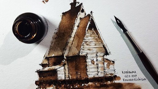 Как нарисовать деревянную церковь - с помощью пера, туши , кисти и совмещения подходов перьевой графики и акварельной техники рисования. Зодчество - старинная деревянная российская архитектура - церковь на сваях в Костроме - быстрый рисунок, набросок. Акварельная техника - в которую я очень стараюсь не уйти - все таки догоняет меня - вот в этом видео отдельно , специально взял кисть. Настоящую. Не только ватербарш обычный. И ооочень этому удивися ...