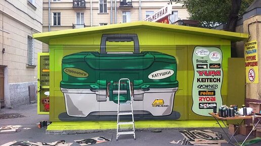 Сегодня мы рассмотрим с какими сложностями сталкивается художник при росписи фасада на примере "Рыбаловного магазина". И если есть окна и их нужно покрасить, как это сделать. Убедимся в удивительных возможностях граффити. Данную роспись заказали для улучшения внешнего вида магазина. Ларек состоит в основном из пластика, который уже около 10 лет находится под солнечными лучами, от чего он и пожелтел. 1) Первым этапом нужно очистить всю грязь с фасада ларька и убрать наклейки, которые прилипли так сильно, что без ножа их сложно снять...
