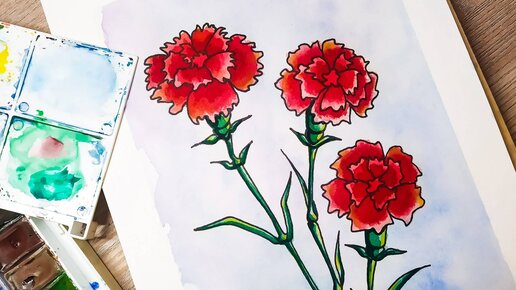 Этап 1. Композиция Намечаем местонахождение на листе и примерную форму будущих цветов. Крупной формой обозначаем бутоны, линиями стебли и листья. Этап 2. Построение Начинаем строить форму цветов: от маленького лепестка в середине до круга крупных лепестков по краям. Также добавляем стеблям толщину, давая больше утолщения в местах, где растут листья. Прорисовываем острую форму листьев. Добавляем лепесткам характерные зазубринки по краям, подчищаем черновые линии. Обводим все контуры тонким перманентным линером на спиртовой основе...