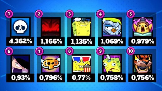 Перед вами топ-10 самых популярных иконок профиля. Базовую иконку с черепом выбирают целых 4,56% игроков. В топе сразу три иконки Спанч Боба — над косметикой в коллабе явно постарались. Иконка Эдгара тоже в списке, от него никуда не деться...