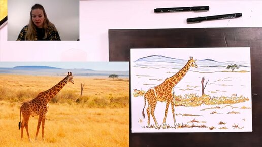 На новом бесплатном уроке Анастасии Брагиной вы нарисуете жирафа посреди африканского пейзажа. В работе мы будем использовать брашпены – своеобразные кисти с резервуаром, наполняемым красящим веществом. По сути, это линеры или даже капиллярные ручки с мягким наконечником, который позволяет получить очень живую линию, меняя только силу нажима...