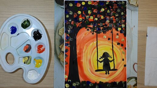 🎨 Рисунок гуашью для детей от 7-8 лет. Качели на осеннем дереве.