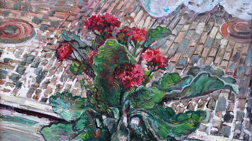 Обычно в картинах я прячу некие скрытые смыслы, тайные послания. Хотя на вид про картину так не сказать. Тут всё просто. Горшок с цветком на подоконнике, рядом зеленое яблоко, за окном брусчатка, на окне штора. Ладно, не буду томить почтенную публику. Это просто такой юмор профессиональный, шутка. Шутка над академической системой. Я училась живописи в РАЖВЗ им.И.С.Глазунова, потом в МГАХИ им.В.И.Сурикова. Долгая учеба, а история о том, почему я так много училась еще длиннее. Отклоняюсь от темы. Возвращаюсь...