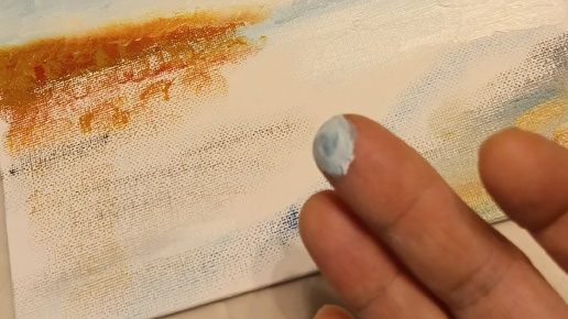 Я не художник, я дилетант. Просто расскажу, как создаю свои работы. Как говорится, спрашивали - отвечаем. Холст, масляные краски, влажные салфетки, чтобы вытирать пальцы, можно взять палитру, можно и без неё, можно взять пару кисточек для прорисовки мелких деталей. Лучше, если у вас перед глазами будет фото, например, реки или заката. Начинаем Намечаю пальцем примерную линию горизонта и ближнего берега реки. Белой краской обозначаю самое светлое место, серой - тёмные участки. На небо - кладу синее пятно...
