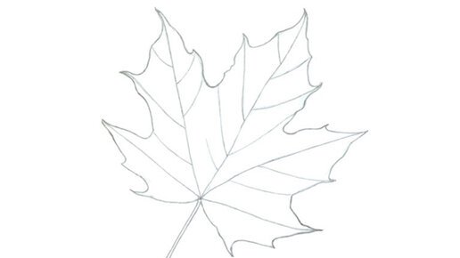 Кленовый лист за три шага Шаг 1 - Эскиз Начните рисунок кленового листа с грубого наброска его основной формы и центральной оси светлыми тонкими линиями. Вам не нужно рисовать какие-либо более мелкие изгибы листа, только некоторые основные линии с соблюдением пропорций разных сторон листа. Шаг 2 - Контур Добавьте к эскизу контурный рисунок внешней формы листа...