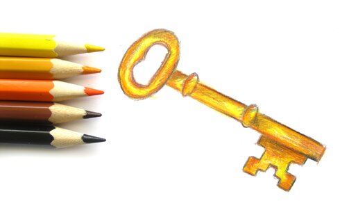 В сказке «Золотой ключик, или Приключения Буратино» главным персонажем является деревянный мальчик с именем Буратино, который получился из полена. Именно ему и достался золотой ключик, но каким трудом! Теперь давайте научимся рисовать такой простой бытовой предмет, как ключ. Его раскрасим такими цветными карандашами, чтобы он выглядел, как золотой. Необходимые материалы: цветные карандаши; простой карандаш; ластик; лист бумаги. Этапы рисования: 1. Золотой ключик рисуем с ручки, за которую будет держаться буратино...