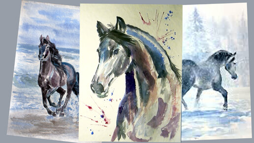 Как нарисовать коня (лошадь) акварелью. Демонстрация рисования 3х лошадей