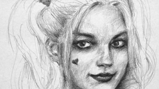 Заключительным примером будет лицо той самой девушки из фильма. Работать будем прямо по фотографии: Начнем с глаз, тонкие брови и зрачки, смотрящие в правую сторону. Для многих нарисовать два одинаковых глаза — это большая проблема. Но так как наш персонаж стоит под углом, означает, что второй глаз может иметь немного другую форму. Работаем над лицом. Штрихи могут быть абсолютно неаккуратными, так как этой такой особенный стиль рисования :) Проводим форму лица и прорисовываем часть волос...