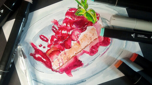 Рисуем кусочек торта спиртовыми маркерами поэтапно.