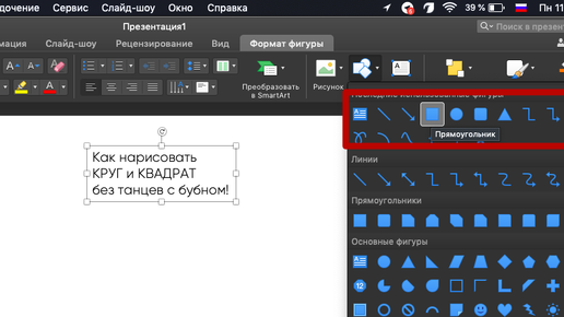 Не задавались вопросом - а почему в ПП нету фигуры квадрат и круг?)) Я думаю задавались и некоторые старались сами сделать круг вручную - тянули, растыкивали, стягивали границы. А ведь оказывается можно нарисовать точный круг и квадрат без каких-либо поддонов на глаз! Все очень просто - заходим в "фигуры" (все манипуляции производятся на ПП для аймака, версия для ПК немного отличается, но не сильно). Выбираем "прямоугольник" (квадрата почему-то разработчики не придумали). И далее с зажатой клавишей SHIFT (либо кнопка со стрелкой вверх на Маке) растягиваем фигуру...