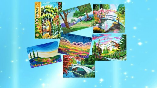 Рисуем летние пейзажи: романтический пейзаж. калитка в цветущий сад, летние сады с мостиками, морской берег с парусником, милый водопадик, южный пейзаж с тополями и др.