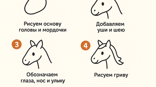 Вот лёгкая пошаговая инструкция, с которой справится даже малыш 👇 🐴 1. Рисуем основу головы и мордочки Нарисуйте небольшой овальчик — это голова.