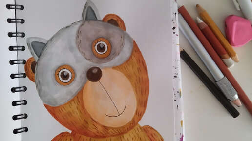 Пошаговый рисунок мишки в маске кота маркерами и цветными карандашами.