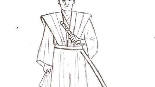 Как нарисовать самурая поэтапно Шаг 1 Статичные позы весьма удобны для изучения пропорций, поэтому стикмена рисовать будет довольно просто. Рост мужчины укладывается примерно в сумму длин семи его голов, из которых три с половиной — четыре приходятся на ноги. Плечи у мужчин намного шире талии(у женщин линии примерно одинакового размера), их ширина равняется сумме ширин примерно трёх голов. Руки, вытянутые по швам, доходят примерно до середины расстояния от пояса до коленного сустава (в этом этапе немного короче, так как стикмены у наших художников не включают в себя кисти рук)...