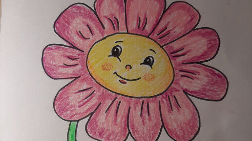 Приветствую читателей моего канала. Зима, февраль. Дуют ветра, небо серое, метут метели. Вспоминается яркое лето, с его теплом и красками. А между тем скоро весна! Природа вновь заиграет яркими свежими красками! А пока предлагаю нарисовать яркий цветок, который напомнит нам о лете. Для этого нам понадобится: белый лист формата А4, черный фломастер или маркер с тонким стержнем, восковые карандаши. Начнем с сердцевинки цветка. Рисуем овал. Внутри овала нарисуем глазки, носик, ротик будущего цветка...