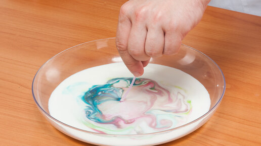 Узоры на молоке Почувствуй себя настоящим экспрессионистом рисуя узоры на молоке Итак, нам потребуется: - неглубокая тарелка; - молоко; - жидкие красители; - жидкое мыло или средство для мытья посуды и стаканчик, куда можно его налить; - ватные палочки; Ход эксперимента - нальем внутри тарелки небольшое количество молока так, чтобы оно покрыло ее дно; - в центре тарелки капнем различными красителями так чтобы образовались цветные пятна; - намочим ватную палочку в жидком мыле и аккуратно коснемся...