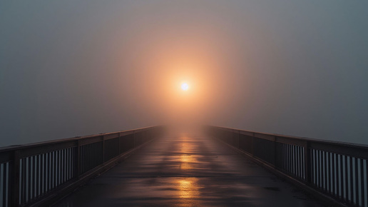 мост, туман, шаг Эти три слова создают напряжение между «здесь» и «там». Мост — символ перемены. Туман — неопределённость. А шаг — это действие, даже если его не видно. Система интерпретирует его как след на мокром дереве, как направление взгляда за кадром, как лёгкое движение в тумане. Результат — изображение с глубиной: узкий деревянный мост уходит в белую дымку...