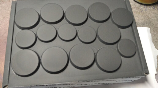 1. Грунтуем базы. 2. Задуваем в любой светлый белый. 3. Задуваем частично в светлый цвет по выбору. Я взял изумруд. 4. Из влажных салфеток под краном смываем то чем она пропитана. Сушим на батарее. 5. Растягиваем салфетку до образования дыр. 6. Задуваем базы через салфетку чёрным. 7. Крепим с помощью блютага базы на что-нибудь чтоб удобно было покрасить кант. 8. Покрываем лаком...