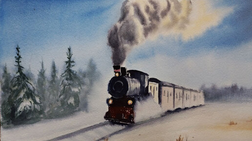 Паровоз. Дым и акварель в технике по сырому