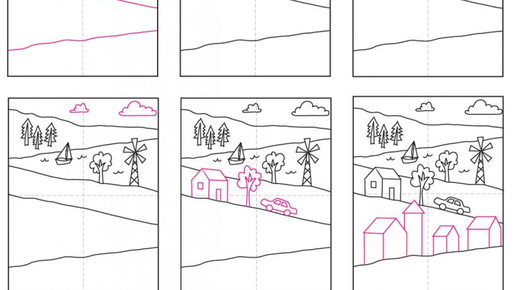 Ниже вы найдёте простое пошаговое руководство по рисованию пейзажа. Этот урок замечательно подходит для детей. Композиция изображения построена так, что оставляет много места для деталей переднего, среднего и заднего планов. Шесть частей пейзажа как бы наслаиваются. При этом предметы, которые ближе к зрителю, выглядят больше тех, которые находятся на заднем плане. Этот пейзаж имеет также дополнительную изюминку в том, что все слои расположены под углом. Приготовьте материалы для рисования и приступайте...