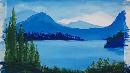 Всем привет! Меня зовут Екатерина, я художник-видеоблогер. Веду свой YouTube канал под названием "TessaArt" :) В этом уроке я покажу как нарисовать пейзаж для начинающих гуашью. Что нам понадобится: Гуашь: Для начала необходимо карандашом разделить лист примерно пополам, это будет линия горизонта. Смешиваем белила титановые и лазурь железную. Начинаем закрашивать небо. Белилами начинаем рисовать самые дальние горы. Затем в белила добавляем немного синей краски, и нежно голубым цветом продолжаем прорисовывать горы...