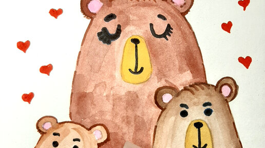 Дню Матери- это добрый и нежный праздник, к этому воскресному дню дети готовят для своих мам подарки. Лучший подарок - это подарок сделанный своими руками. Предлагаю вам нарисовать открытку с мишками на День Матери по шагам. Открытку лучше делать на половину альбомного листа. Рисовать её нужно акварелью и фломастерами. Начнём) Нарисуйте контур мамы медведицы. Добавьте слева и справа дочку и сыночка медвежат. Нарисуйте всем ушки. Сотрите лишние линии. В центре мордочки нарисуйте нос, рот и глаза...