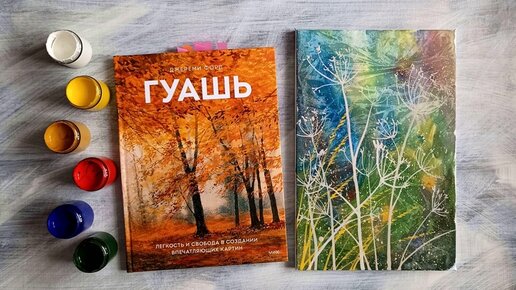 Материалы для рисования: Посмотреть весь процесс на видео: Последовательность действий: 1. Создаем фон: наносим легкий слой воды мягкой синтетикой, далее — пятна краски (зеленый, желтый, охра, синий и др.). Пока краска не высохла, растираем их, перемешивая цвета прямо на поверхности бумаги. Не давая краске подсохнуть (можно дополнительно сбрызнуть поверхность водой из пульверизатора), укладываем пищевую пленку, немного сминая ее. Оставляем фон сохнуть. Убираем пленку после высыхания. 2. Поверх сухого фона рисуем разнообразные тонкие линии травинок и зонтичных растений...