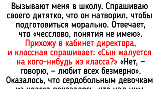 Фраза «Родителей в школу!» обычно не сулит ничего хорошего, но для героев нашей статьи она стала началом занимательных семейных баек. В этой подборке вы узнаете, как один папа ловко ответил на замечание о короткой юбке дочери и почему иногда «на ковер» к учителю стоит послать свекровь. Дочь пошла в лицей с углубленным изучением английского. К третьему классу «шпрехала» вовсю. Тут мы сменили город, и дочь пошла в новую школу. Там дети только алфавит начали изучать, что для дочери было уже пройденными азами...