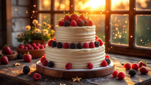 ягоды, торт, смех На первый взгляд — просто. Но в этих словах уже есть движение: яркие, вкусные ягоды, торт — свежий, украшенный, а смех — это не объект, а звук, который вы должны «нарисовать». Система интерпретирует его как размытые брызги шампанского, лёгкие складки на скатерти, будто от движения, или даже искры в воздухе...