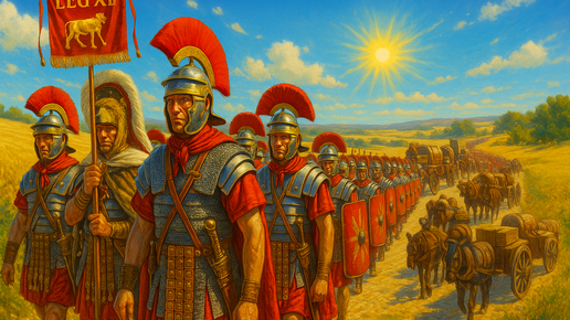 Каждая ночь в римской армии заканчивалась одинаково — во временном лагере, построенном накануне. С первыми лучами солнца всё приводилось в движение по чётко отработанному сигналу трубы — буцины. Первый звук означал начало сборов: легионеры сворачивали палатки, начиная с палатки командующего. Затем шло укладывание снаряжения. Второй сигнал подсказывал, что пора грузить вьючных животных. Третий был финальным: армия снималась с места и начинала марш. Историк Иосиф Флавий в «Иудейской войне» оставил подробное описание того, как выглядела колонна в пути...