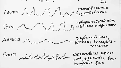 ДЛЯ НОВИЧКОВ Вы, наверняка. знаете, что мозг человека работает в 5-ти различных ритмах. А вы знали, что рисование определенных сюжетов настраивает человека на соответствующее внутреннее состояние? Ритмы головного мозга разделяются на ритмы активности и релакса. Все ритмы ниже на фото. Эти линии очень и очень похожи на нейрографическую линию. И это активно используется в НейроГрафике. Если вам нужно быстро проснуться с утра, порисуйте линии в стиле гамма и бета волн. Если же нужно быстрее заснуть или расслабиться, порисуйте линии в стиле тета и дельта волн...