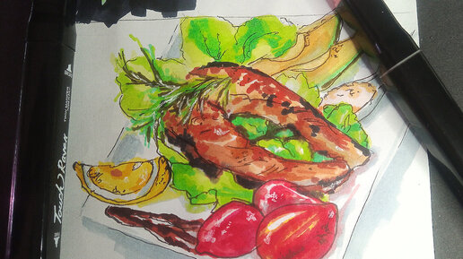 Как рисовать просто? "Вкусные" зарисовки. Рисуем кусочек рыбы в овощах.
