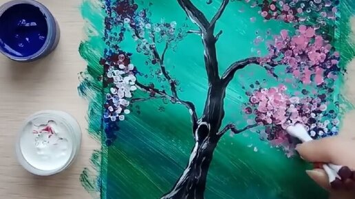 Всем привет! Меня зовут Екатерина, я художник-видеоблогер. Веду свой YouTube канал под названием "TessaArt" :) Сегодня я предлагаю нарисовать сказочное дерево, очень просто с помощью ватных палочек. Материалы : Гуашь (у меня был набор от фирмы «Луч»): Для фона нам понадобится голубая, зеленая, изумрудная и белая гуашь. А так же кисть щетина 12 размер. Нам нужно закрасить лист, и по краям он будет более тёмный, поэтому наносим туда синюю краску, а в центре будет более светлая. Не бойтесь смешивать цвета прямо на листе...
