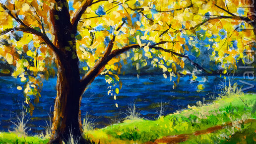 Сегодня мы с Вами напишем картину Солнечные деревья на берегу акриловыми красками на холсте с подробными и поэтапными пояснениями художника Валерий Рыбакова.