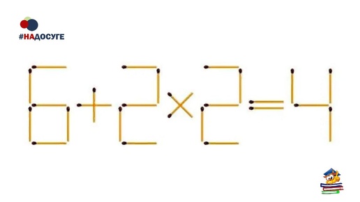 Спички детям не игрушки, но задания с ними нравятся и детям, и взрослым. На этой картинке нужно передвинуть ровно одну спичку, чтобы получить верное равенство. Еще и порядок действий повторим. Сложно, но вполне решаемо...