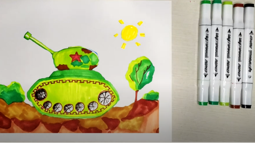 Нарисовать военный танк папе, дедушке или брату очень легко. Можно воспользоваться нашим легким поэтапным видеоурокам и рисунок будет готов на раз, два, три! Рисуйте по пунктам из статьи или смотрите легкое видео в конце статьи. Для рисунка нам понадобится: альбомный лист А4, карандаш, стирательная резинка, гуашь - белая и синяя цвета, кисточки (плоская), стаканчик с водой, маркеры- разные оттенки зеленого, коричневого, красный, желтый, тонкий черный маркер. Бумагу для рисования лучше брать плотную, 200 г/м2...