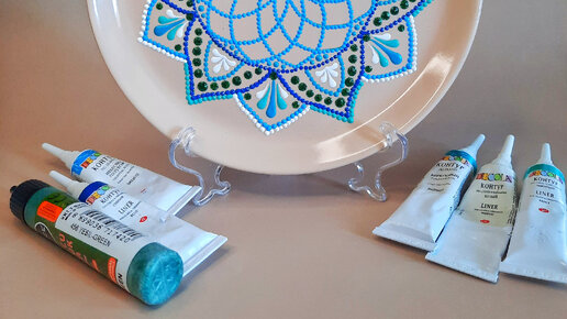 Добро пожаловать на мой канал "Мандалы, точечная роспись, декор" В этой статья, я пошагово разберу этапы росписи керамической тарелки. Мастер класс в видео формате можно посмотреть на моём канале. Для росписи я использовала контуры фирмы Decola: белый, бирюзовый, синий, голубой, мятный. А также глитер от Каденс зеленого цвета. Также я использовала мандалу, которую можно нарисовать самостоятельно. Видео можно посмотреть тут: Рисуем простую мандалу самостоятельно. И мы начинаем наш творческий процесс...