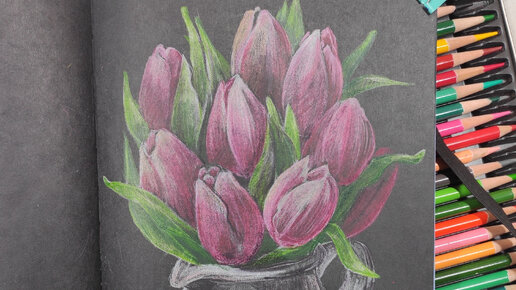 Видели у меня в обзоре карандашей Deli рисунок?)) Ловите пошаговый мастер-класс .) Конечно, на черном и цветными карандашами ) 1. Традиционно начинаем с построения . На черном я строю белым карандашом: виднее и сразу можно обозначать светлые места. 2. Дальше намечаем формы поменьше. Принцип построения любой работы - от большего к меньшему. Сначала общие объемы, потом деталировка. 3. Намечаем, где у нас будут сами цветы. 4. Продолжаем построение 5. Убираем лишние линии построения, уточняем форму вазочки...