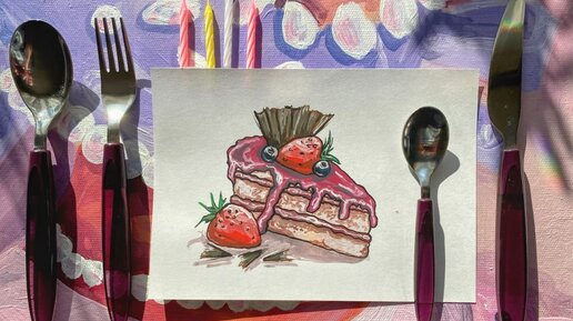 Этап 1. Композиция Друзья, написание вкусного тортика мы начнём с геометрии, а именно с фигуры с треугольным основанием и прямыми гранями: кусочек торта. Добавьте несколько продольных линий, показывающих толщину слоев коржа. Этап 2. Построение Базовую фигуру наполните кремом в центре, сверху добавьте потеков объемного крема, а в качестве украшения будем рисовать клубничку, ягоды голубики и шоколадную стружку. Этап 3. Цвет Работу с краской начинаем с базовых заливок всех элементов. Коржи у нас будут...